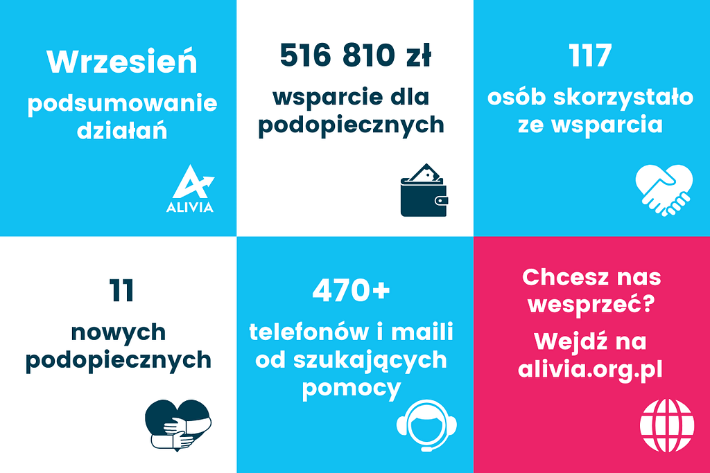 Podsumowując wrzesień, widzimy setki osób, którym wspólnie pomogliśmy, i tysiące, które dzięki naszym programom mogły znaleźć potrzebne informacje. To właśnie jest siłą Onkofundacji Alivia – realne wsparcie dla pacjentów i ich bliskich. Dołącz do nas – wspieraj, udostępniaj, mów o Alivii. Razem dodawajmy odwagi chorym na raka!